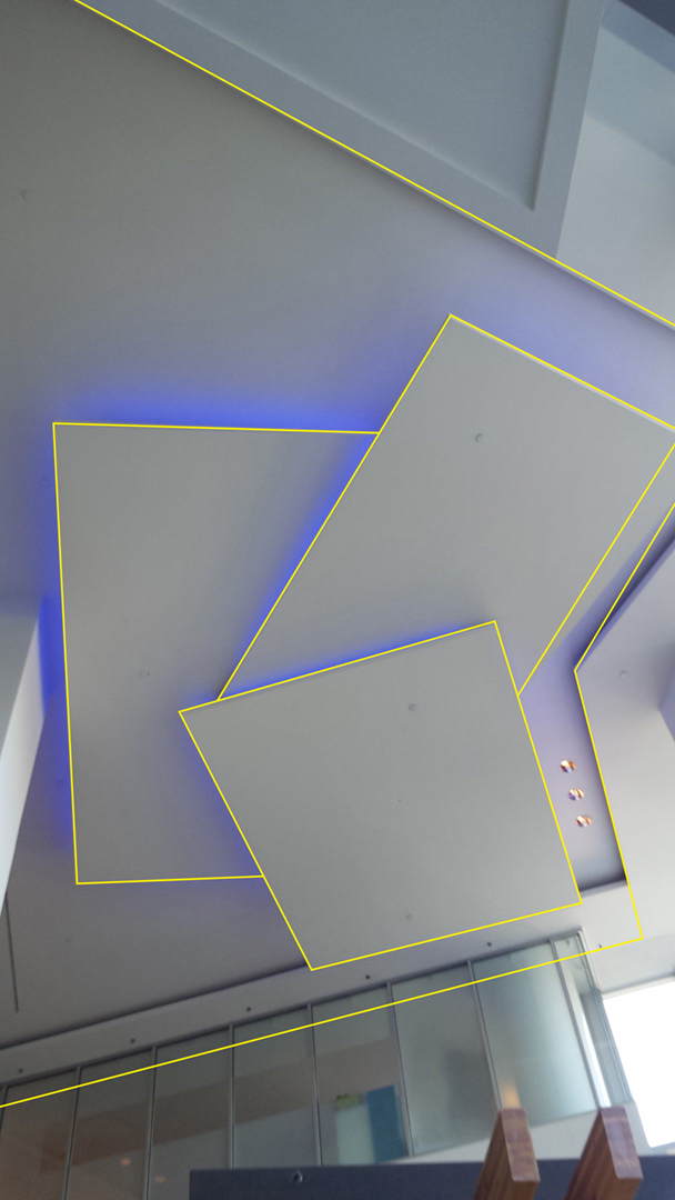 This shapes on the lobby's ceiling caught my attention, I thought I could use them in some interesting way. Which I did, I used them as the shapes for the background to have some transparent elements breaking the monotony of an all blue background. Also, I thought that in the future if the client decided to add animation to the screen, those elements would work very well for that purpose. Kind of like what you see in news channels, the main elements with the information can be static but there some subtle movements happening around.